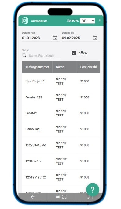 Alle Aufträge sind in der „Auftragsliste“ verfügbar. Hier können Sie nach Namem oder Postleitzahl suchen und die Aufträge nach dem angegebenen Datum filtern, damit kein Auftrag verloren geht.