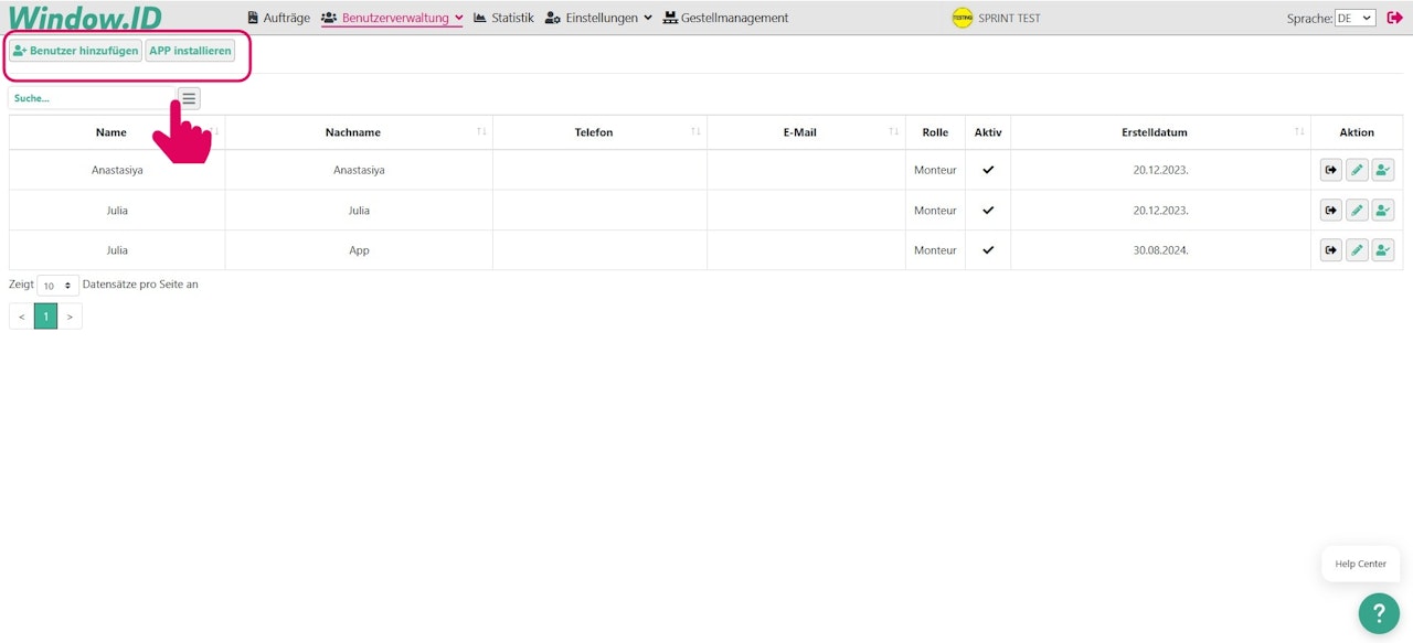 Wenn Sie einen neuen Installateur oder ein neues Installationsteam zur Window.ID App hinzufügen möchten, können Sie dies auf der Registerkarte "Benutzerverwaltung" tun, indem Sie "App" auswählen.