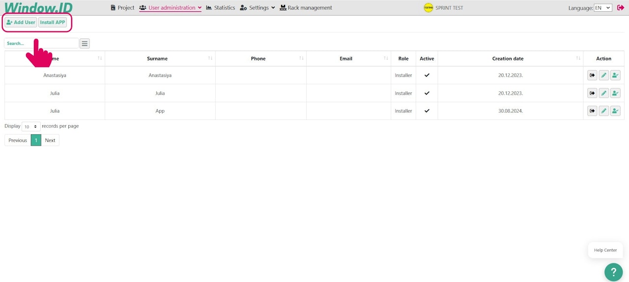 If you need to add a new installer or installation team to the Window.ID App, you can do so in the "User Administration" tab by selecting "App".