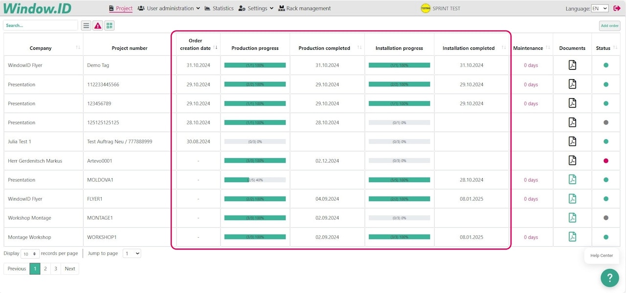 Installation completed - the date in this column will only appear after all constructions in the order have been installed;