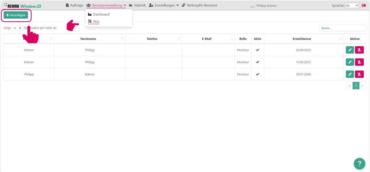 Jeśli chcesz dodać nowy instalator lub zespół instalacyjny do aplikacji Window.ID, możesz to zrobić w zakładce „Zarządzanie użytkownikami”, wybierając „Aplikacja”.
